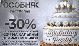 В гастропабе «ОСОБНЯК», при составлении предзаказа, с воскресенья по четверг действует скидка для именинников - 30% на меню кухни и 20% на меню бестабачных и безникотиновых кальянов!
