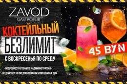 С воскресенья по среду в гастропабе-караоке ZAVOD действует специальное предложение «Коктейльный безлимит» — 45 BYN.